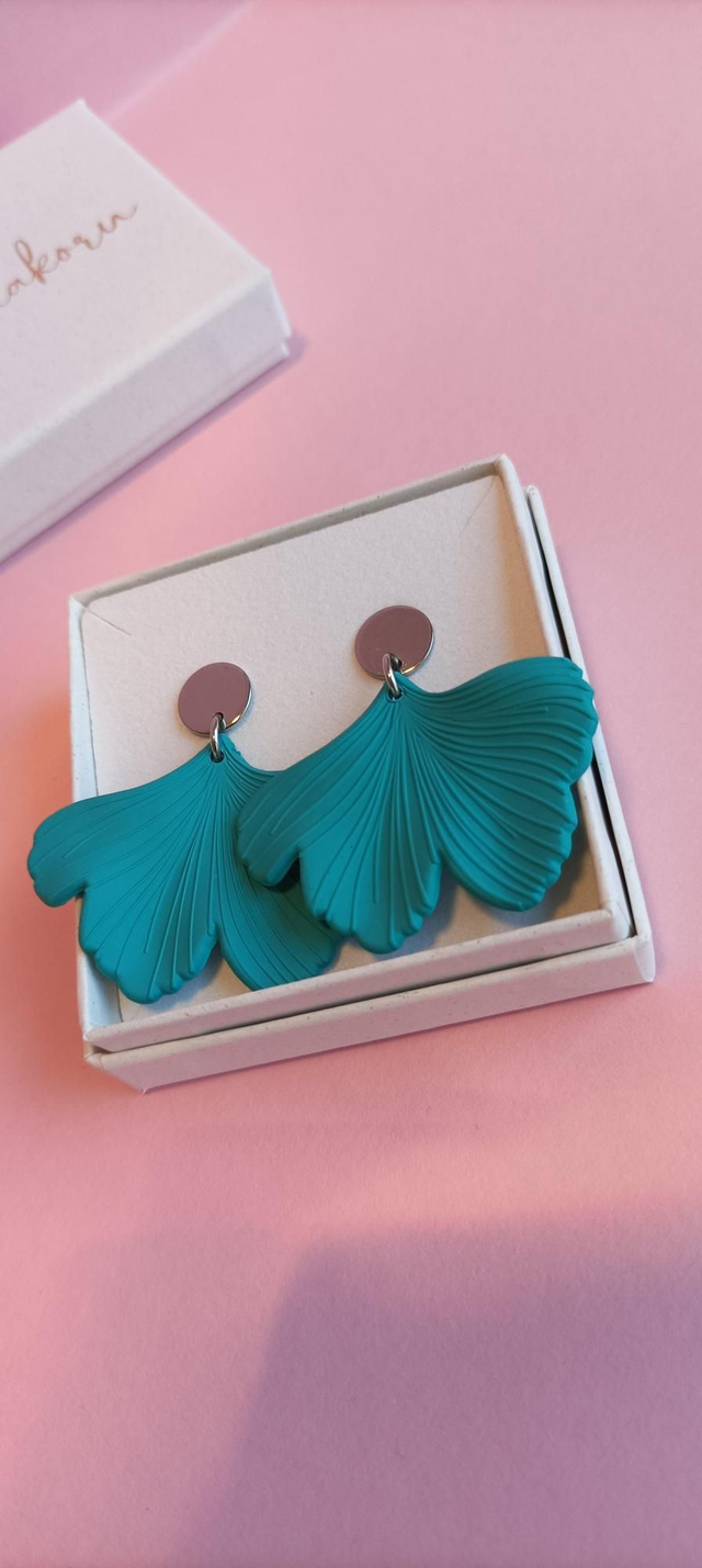 Kauniin turkoosit Ginkgo -lehtikorvakorut, joka on Neidonhiuspuun lehti. Ginkgo symboloi rakkautta ja toivoa, mutta myös voimaa ja muuttumattomuutta. Näyttävät korvakorut sopivat niin arkeen kuin juhlaan.