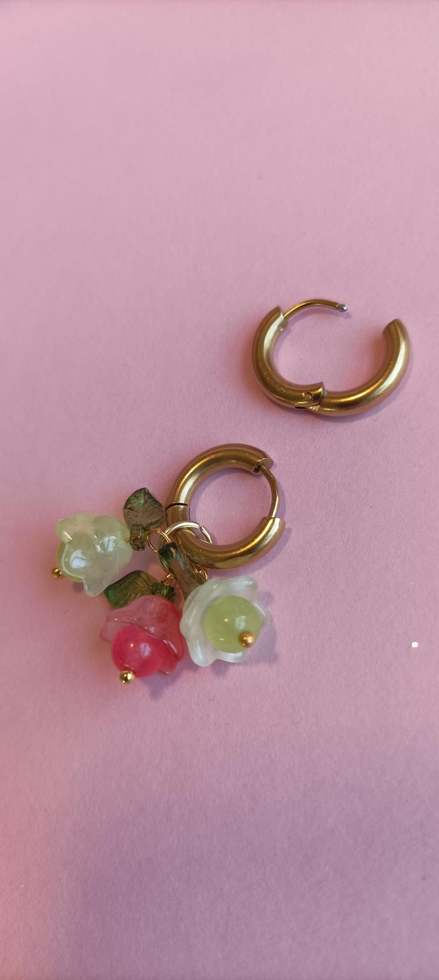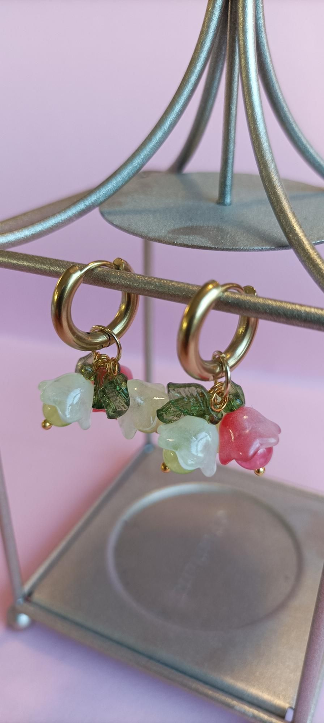 Hempeän väriset Kukkaustytön korvakorut, joissa on kaksi vihreää ja yksi punainen kukka.