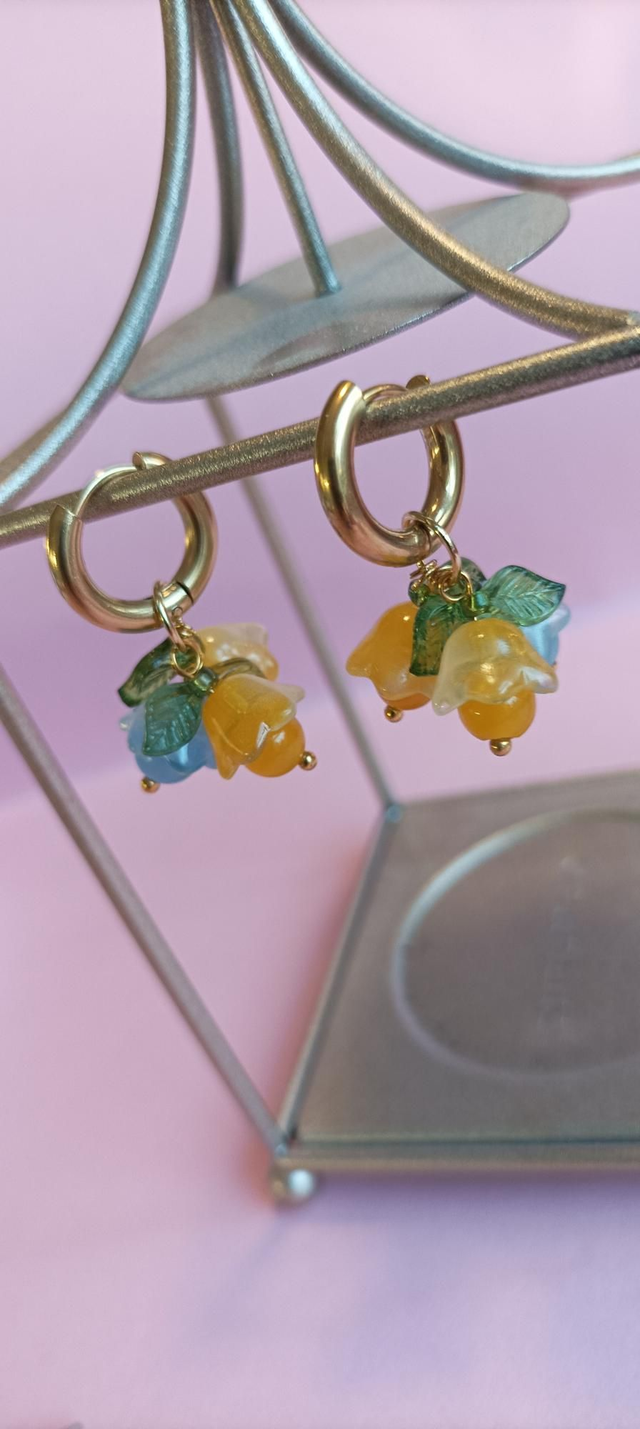 Hempeän väriset Kukkaistytön korvakorut, joissa on kaksi oranssia ja yksi sininen kukka. Nämä korvakorut sopivat mainiosti niin arjessa käytettäväksi kuin juhlaankin.