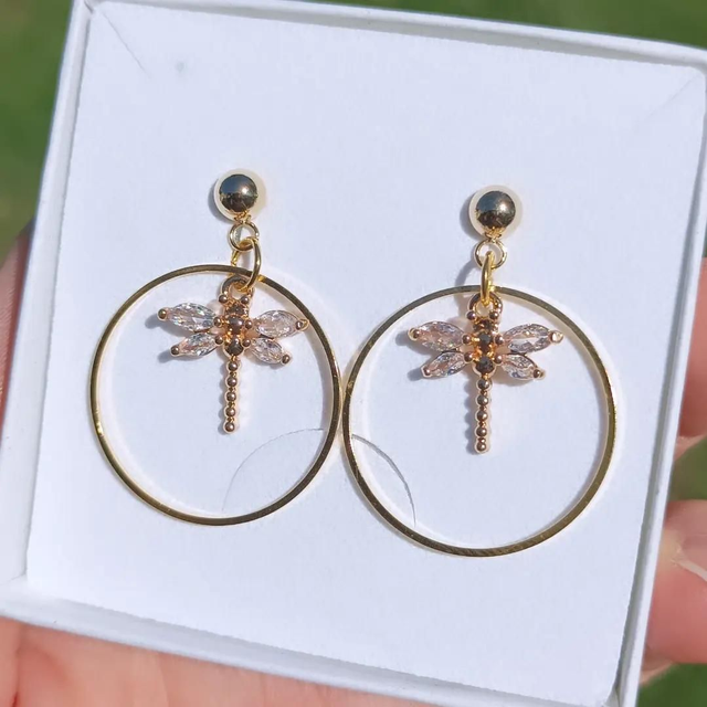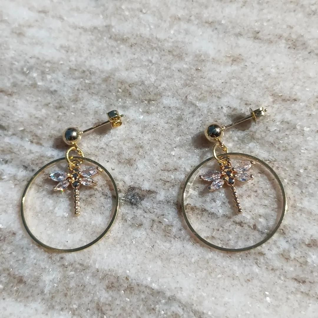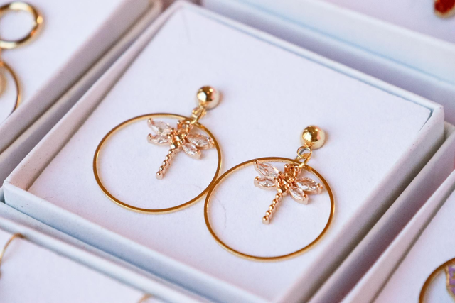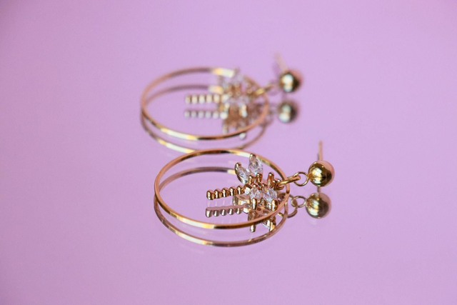 Korvakorujen materiaali: kirurginteräs (korvan lävistävä osa), zirkonia, pyöreä korulinkki 24k kullattua messinkiä.