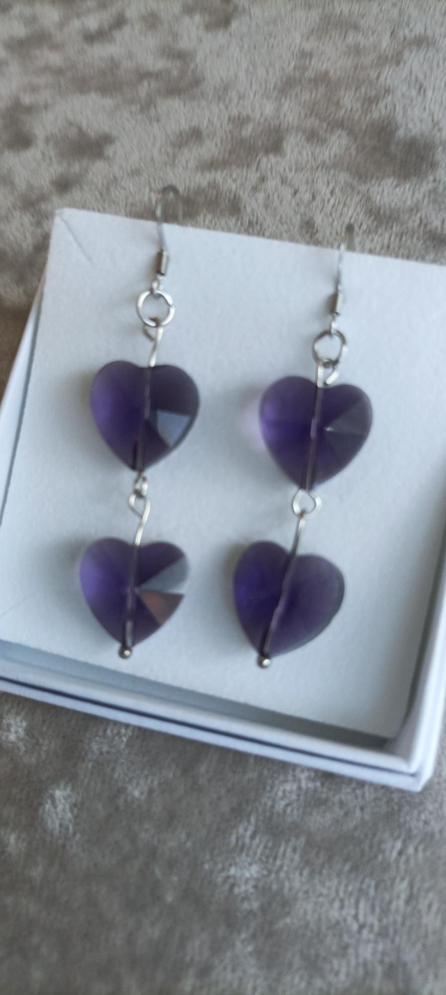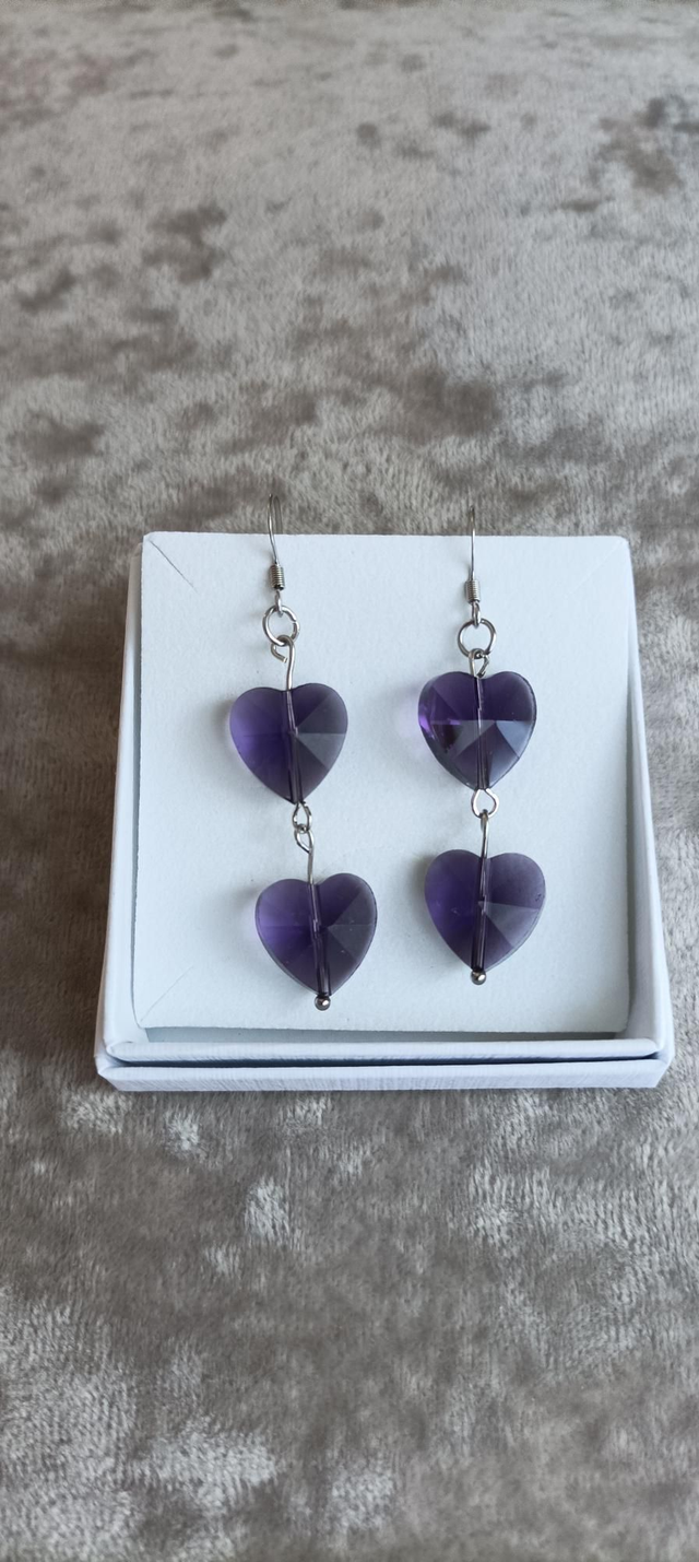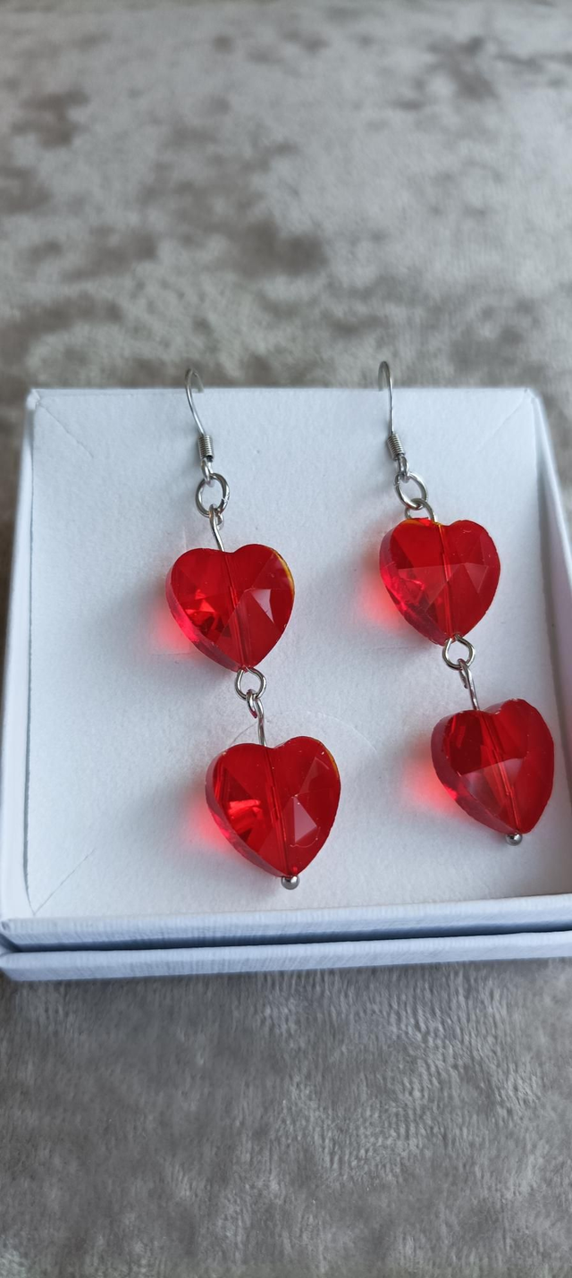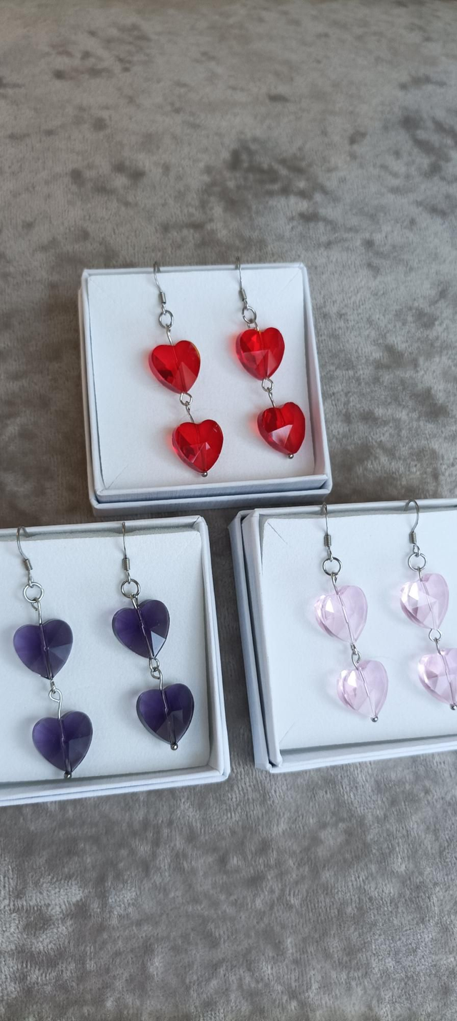 Materiaalit: ruostumaton teräs ja lasihelmi. Korvakorujen korkeus on noin 6 cm. Sydän -korvakoruja on saatavilla vaaleanpunaisina, punaisina sekä violetteina.