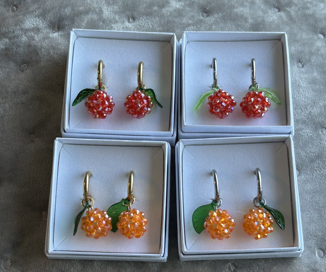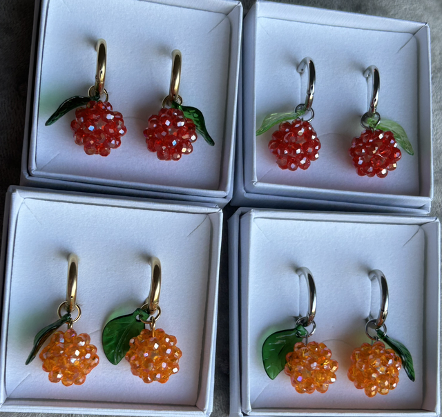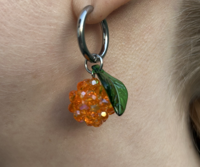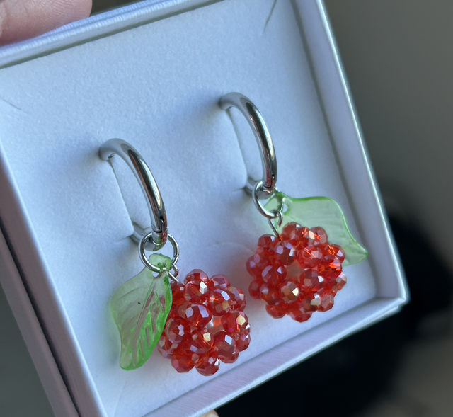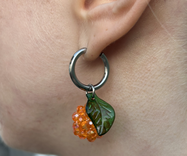 Kimaltelevat helmet muodostavat mehukkaan marjan, ja vihreä lehti tuo koruun raikkaan yksityiskohdan. Jos haluat lehden vaaleanvihreänä, mainitse siitä tilauksen lisätiedoissa. Mainitse myös, jos haluat tämän korvakorun ilman lehteä.